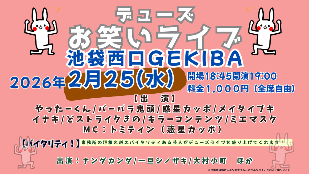 所属の垣根なく、バイタリティある芸人が毎月デューズライブを盛り上げてくれます!