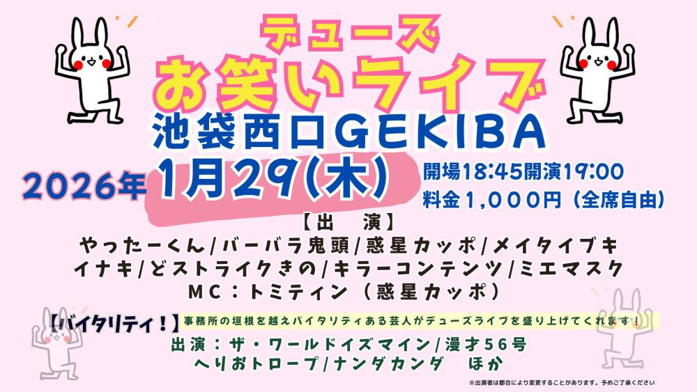 所属の垣根なく、バイタリティある芸人が毎月デューズライブを盛り上げてくれます!