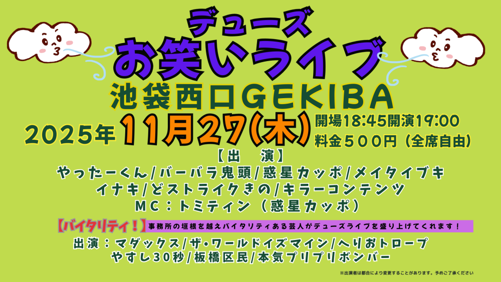 デューズお笑いライブ開催!!(予約サイトはこちら)